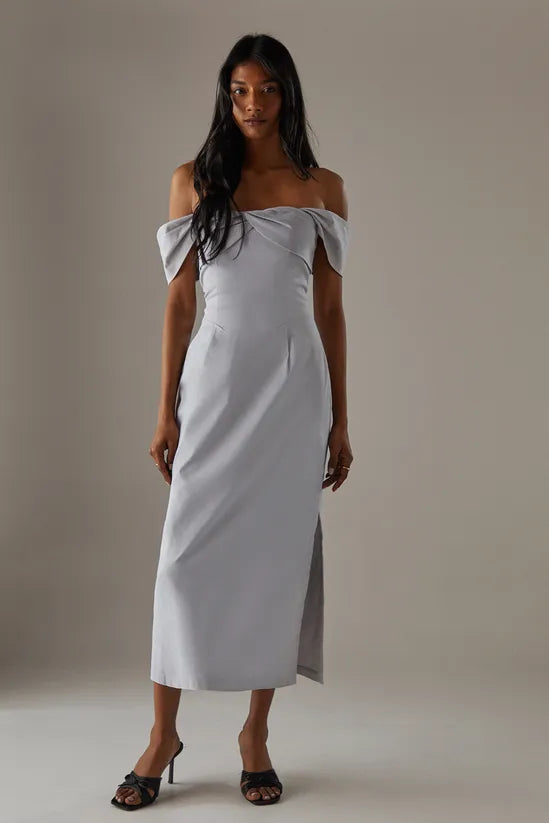 - Elegant bandeau neckline with off-shoulder twist detail